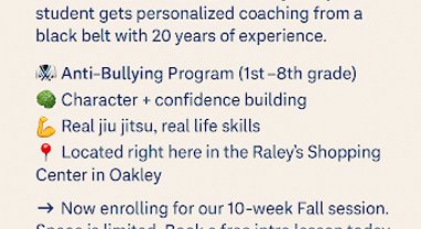 Growth Mindset Collective is a community-centered jiu jitsu academy in Oakley offering group classes and semi-private programs for all ages. We specialize in structured programs like our Adult Beginner Jiu Jitsu Course, Children's Anti-Bullying Program, Women's Self-Defense Course, and Competition Team Training. Classes are available in both Gi and No-Gi, and we also offer a 1-day-per-week wrestling class to complement your training. Whether you're brand new or looking to compete, every class is led by Coach Mark Miller, a black belt under 5x World Champion Eduardo Rocha. Join our supportive environment and start your journey today. We are located at 2031 Main St. Oakley, CA 94561.